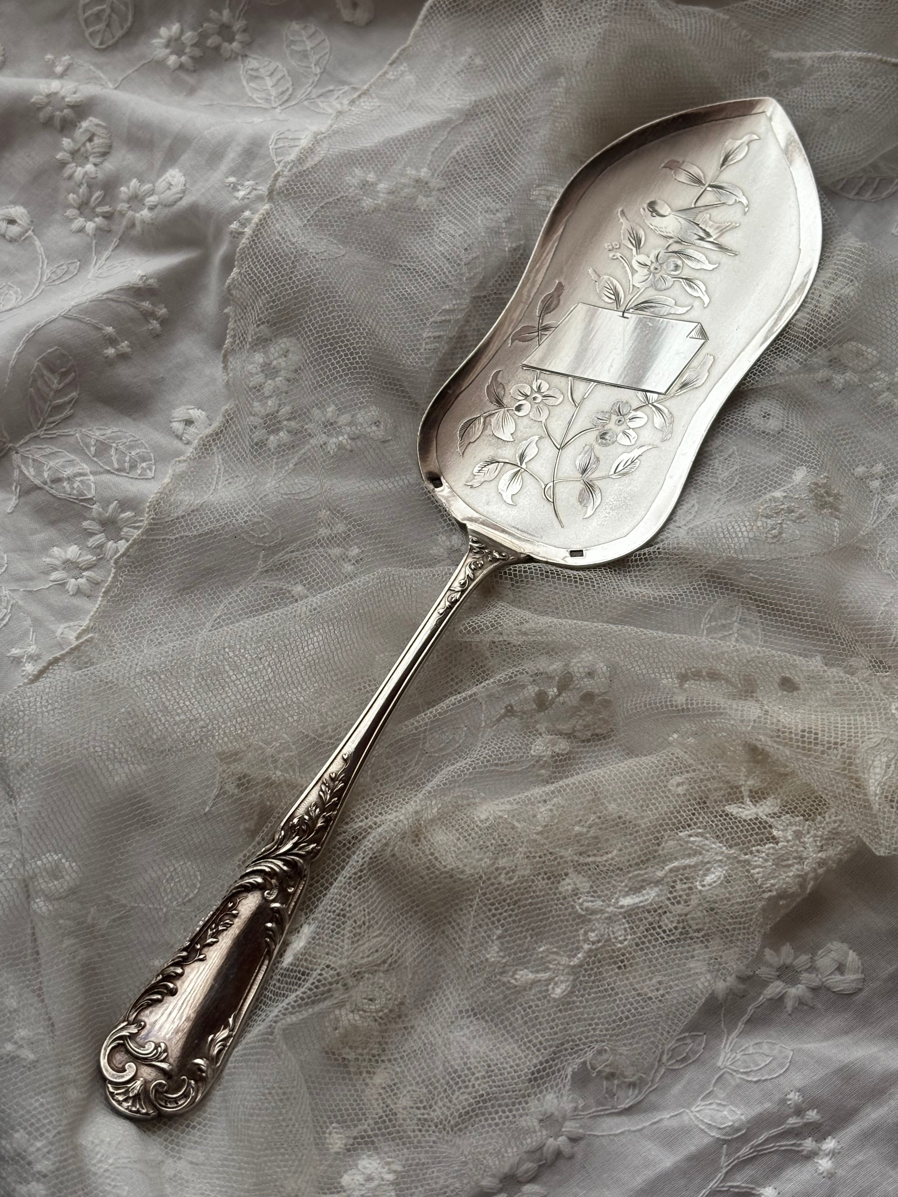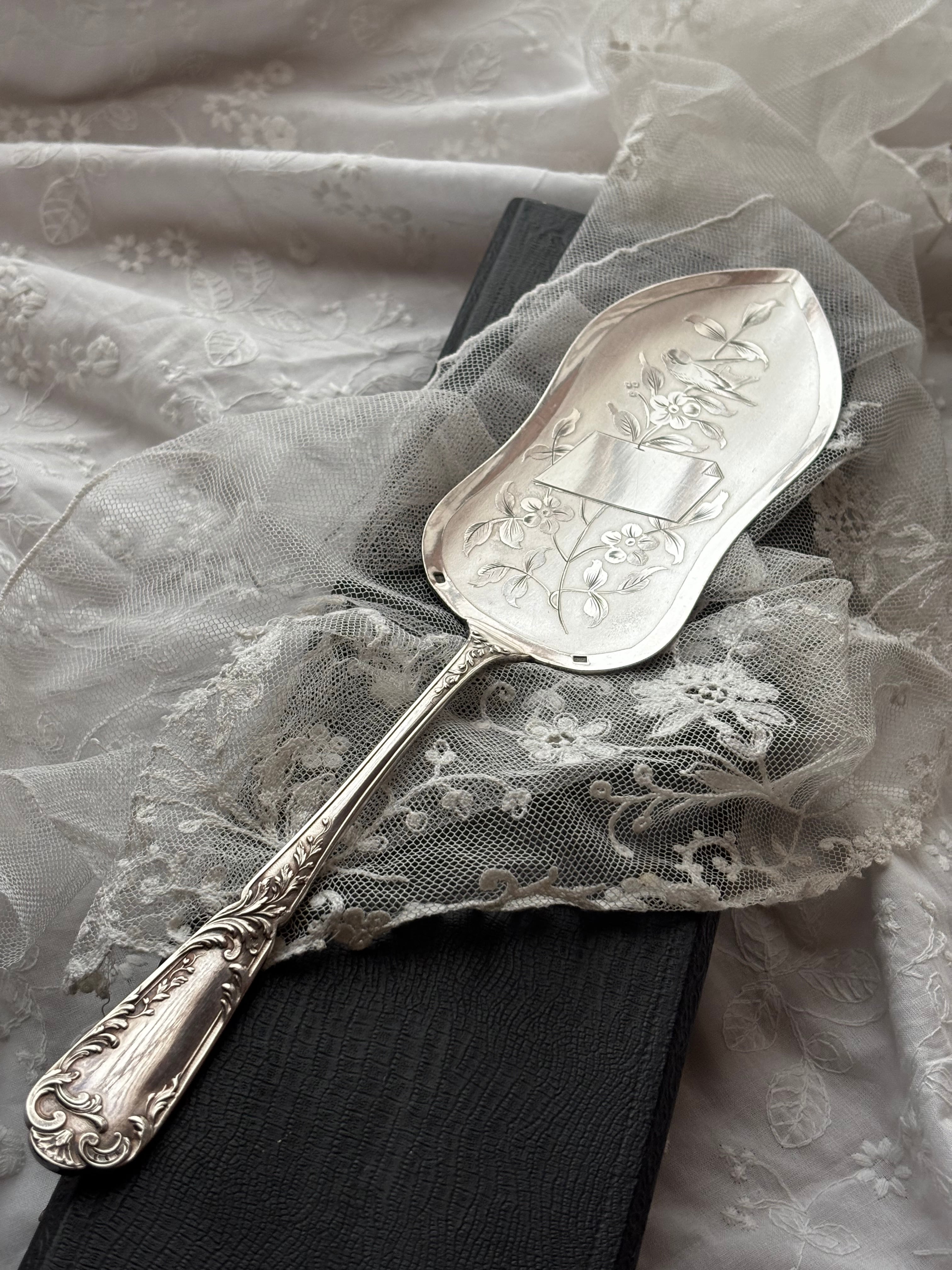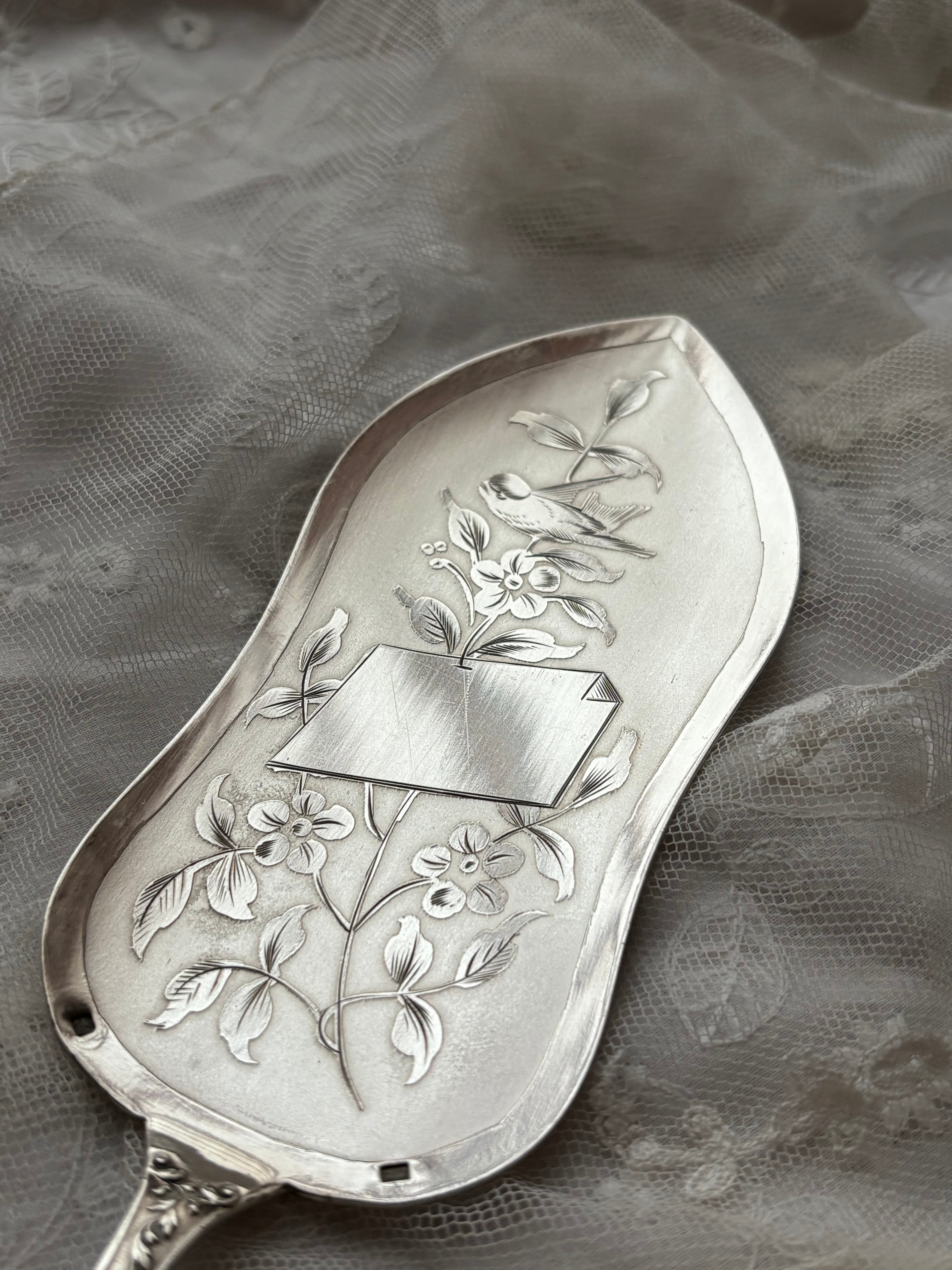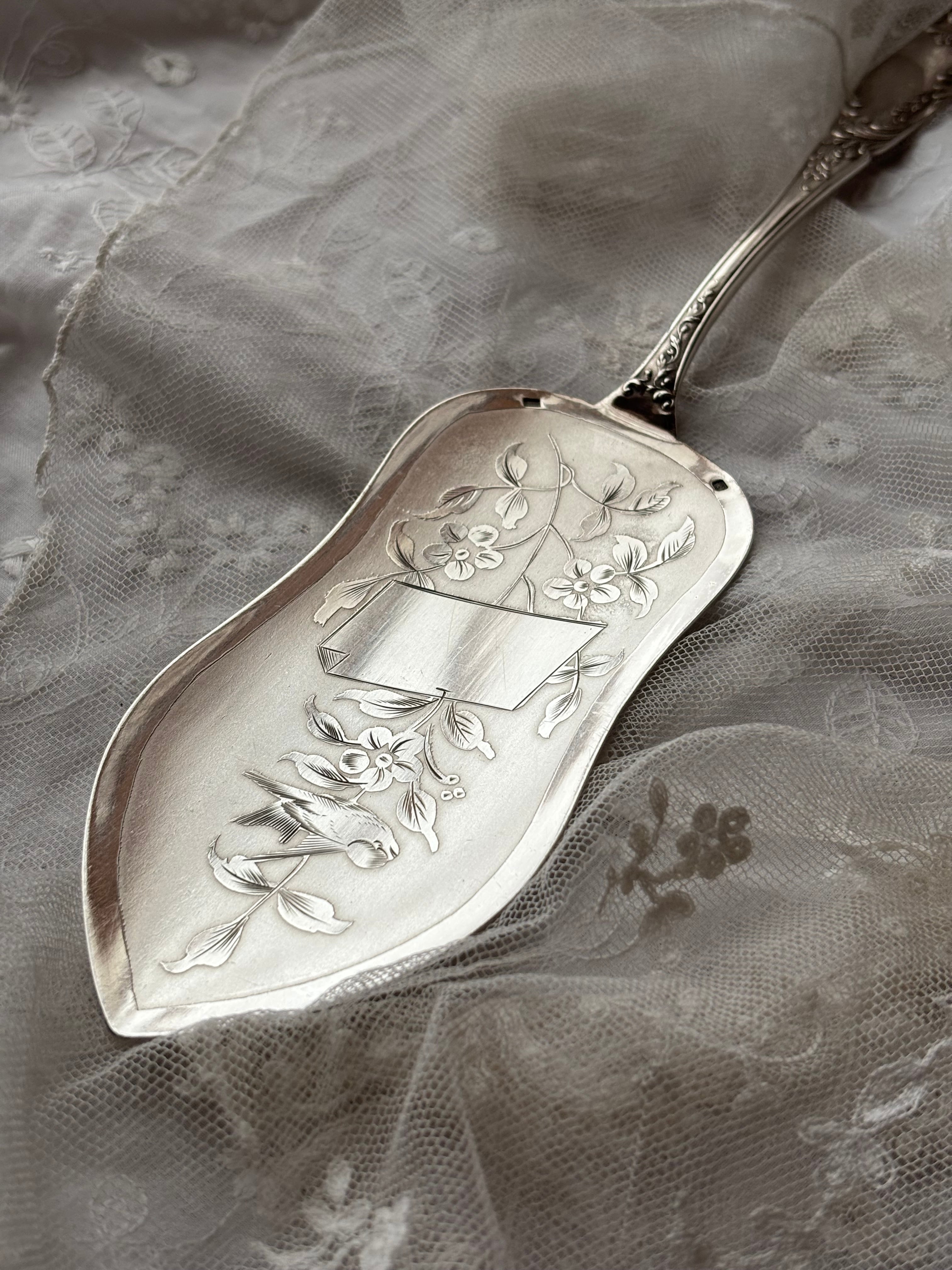 英国製 シルバープレート ケーキサーバー — 鳥と草花のエングレービング/専用ケース付き