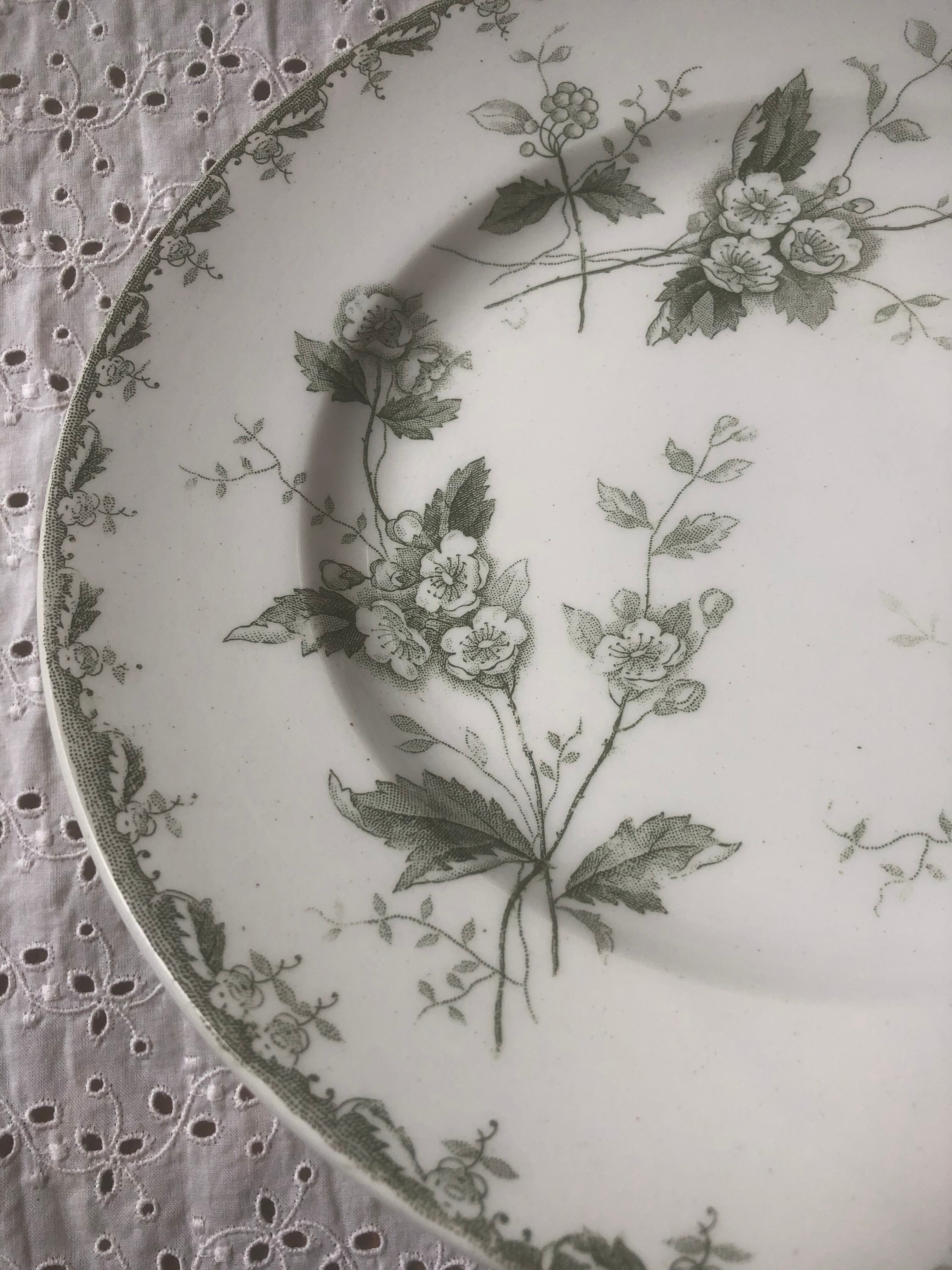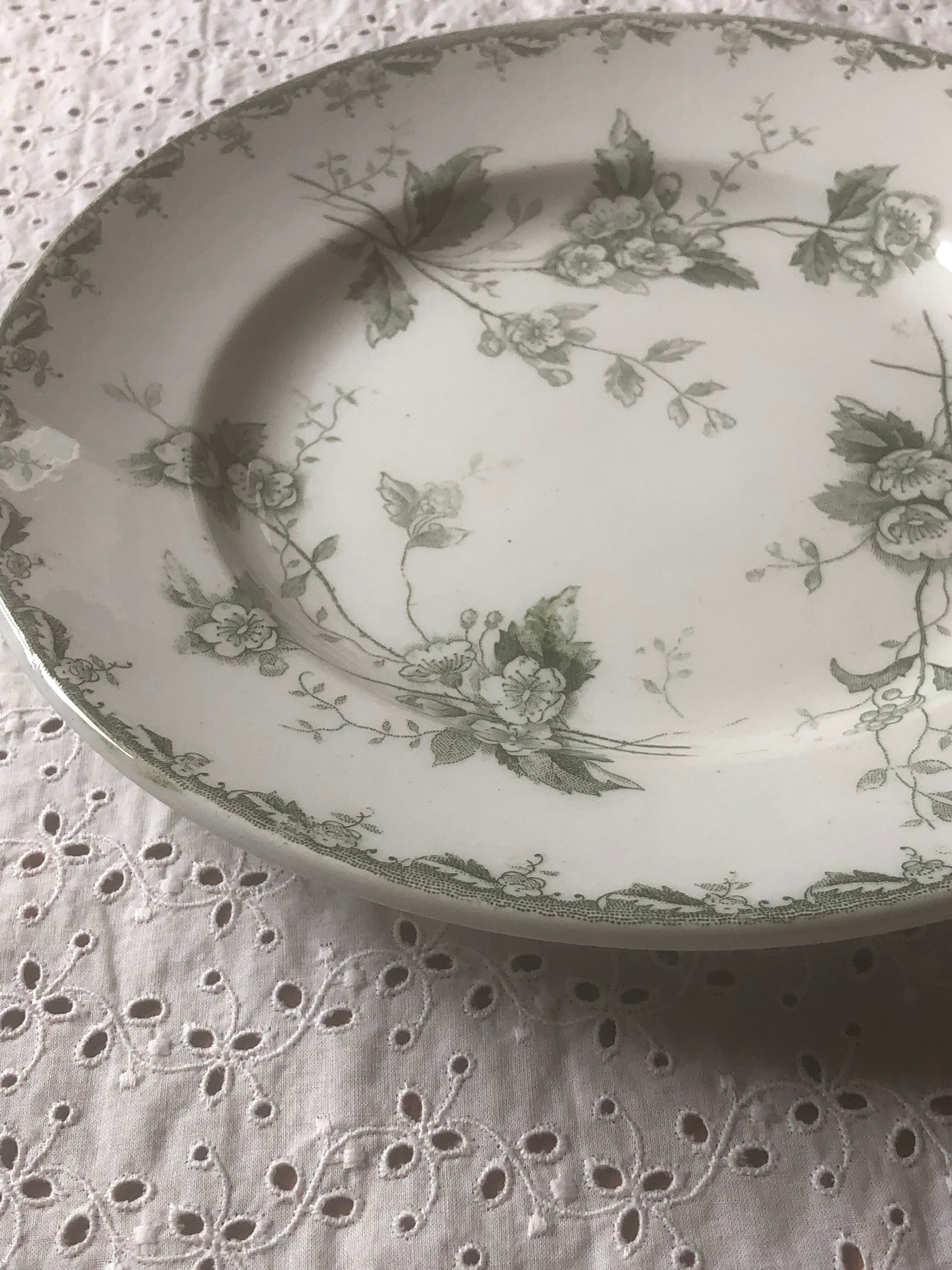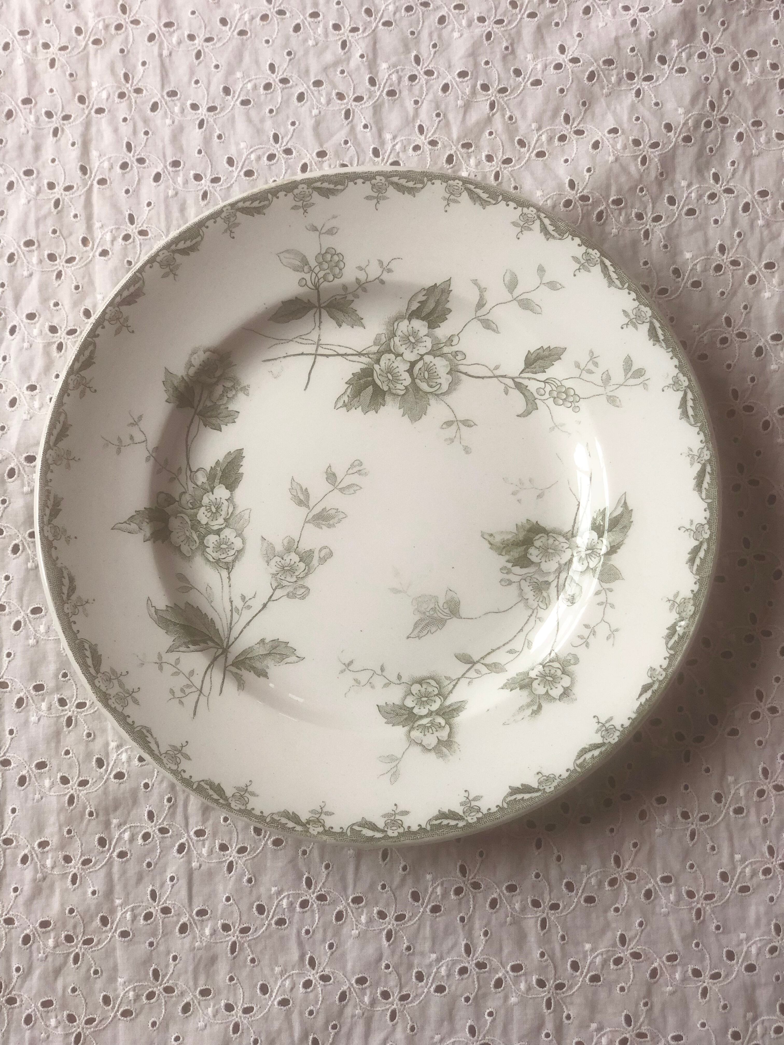 小バラが繊細に優しく描かれたプレートです。爽やかな新緑をイメージさせるお皿です。